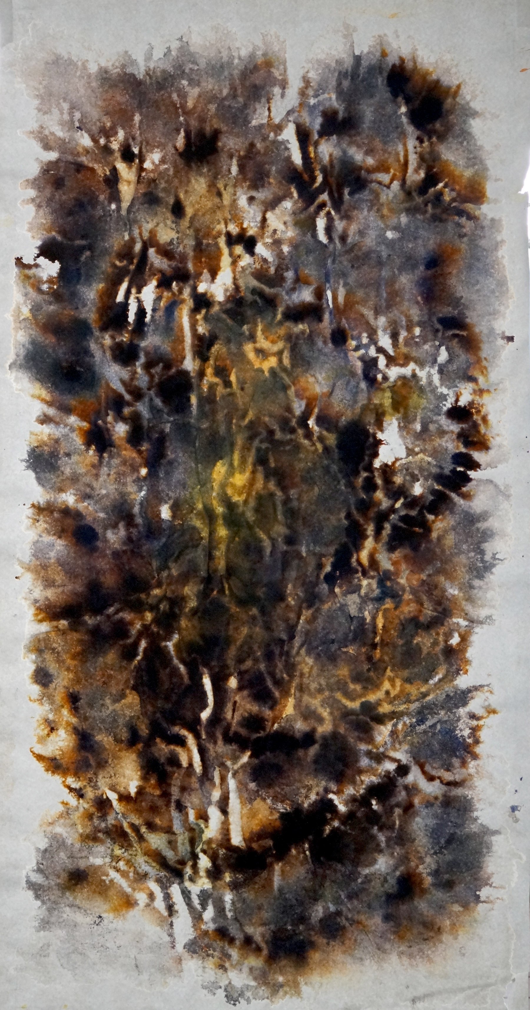 Visual Imagining (layer 1). April 25, 2025. Watercolour, cartridge ink and sumi ink on mulberry paper. 69cm x 136cm.